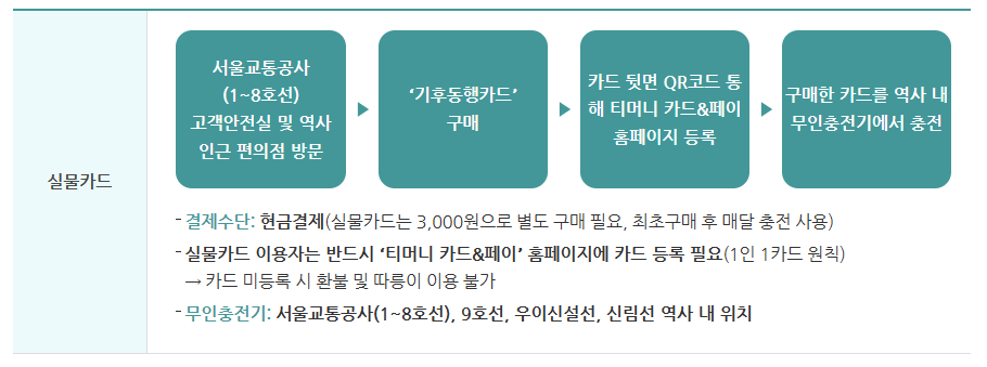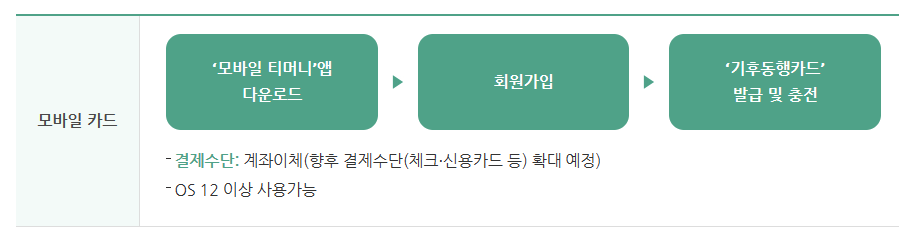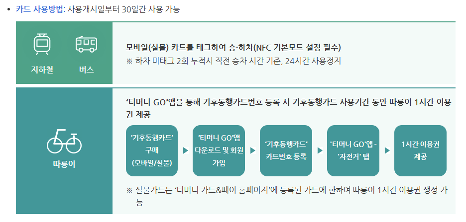 아래에 링크를 통해 모바일 티머니 앱을 설치 / 가입 후에 기후동행카드 발급, 충전 이후에 사용이 가능합니다.