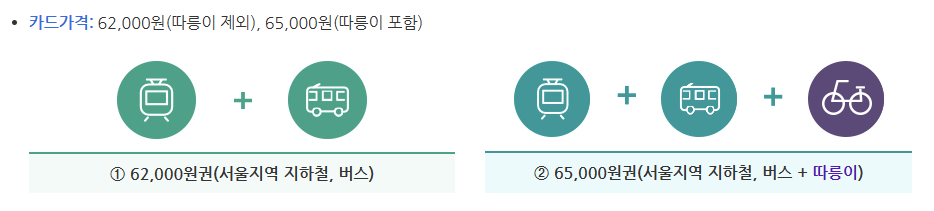 최대 65,000원으로 버스, 지하철, 공용자전거를 무제한으로 이용이 가능합니다.