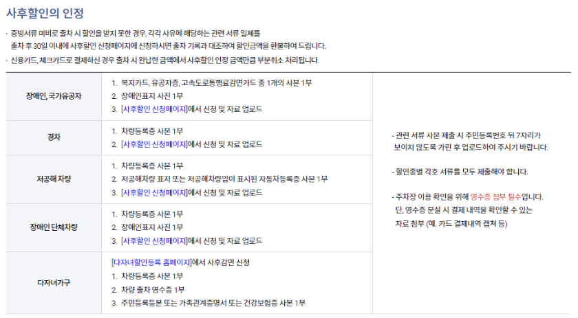할인조건에 해당되지만 요금 정산시 할인을 받지 못했다고 해도 당황하지 마시고, 사후환불제도를 통해 주차요금을 할인을 받을 수가 있습니다. 증빙서류 미비로 할인을 받지 못한 경우 할인신청서를 출자 후 30일니내 제출해야 할인금액을 돌려 받을 수가 있습니다.