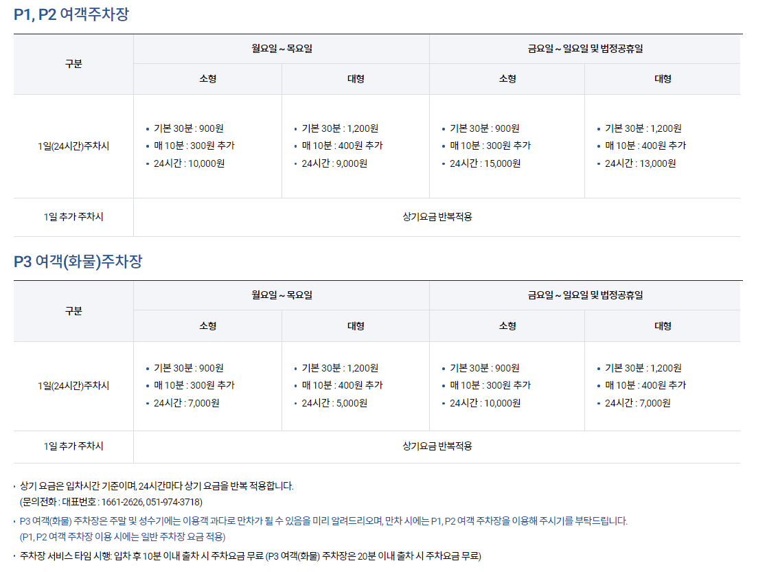 여행객들이 주로 이용하게 되는 김해공항 P1, P2 여객주차장의 주차요금은 아래와 같습니다.