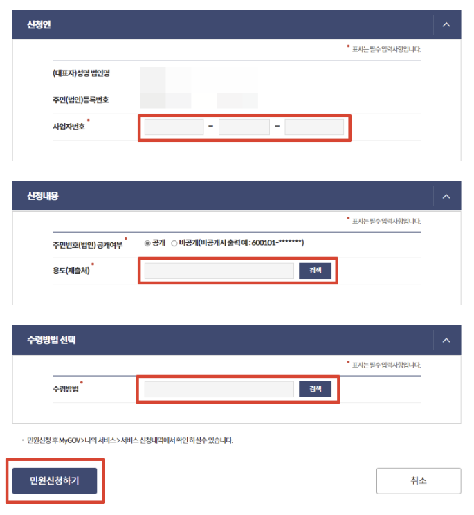 5. 빈칸에 '사업자번호' 를 넣으시고 '용도'는 사용하려는 목적에 맞게 선택합니다.