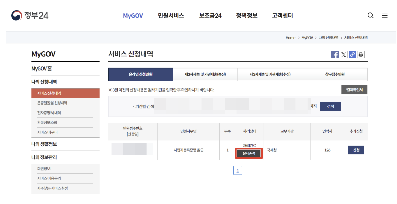 6. 민원신청하기 누르시고나면 바로 문서처리가 되어서 '문서출력' 을 누르셔서 인쇄합니다.