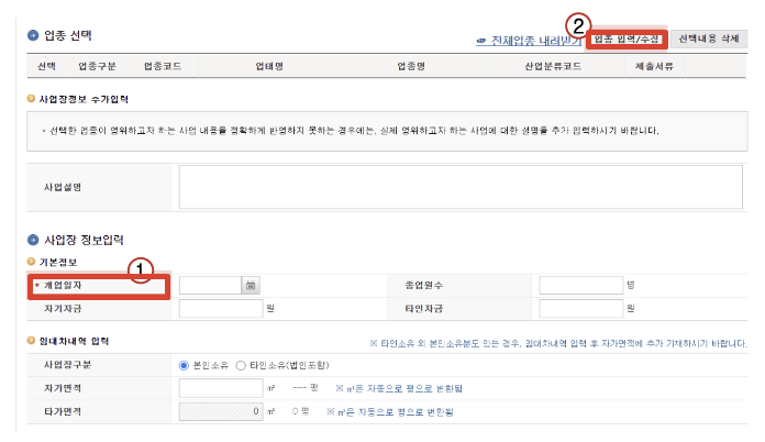 5. '개업일자'를 원하는 날짜로 선택하고 '업종 입력/수정'을 누르고 '업종코드'를 원하시는 것으로 선택합니다.