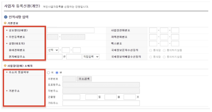 4. 상호명, 주민등록번호, 성명, 주소지 동일여부, 기본주소를 입력합니다.
