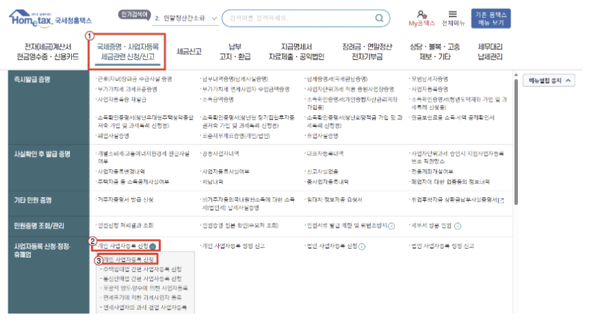 3. 국세청 홈페이지 상단 메뉴에서 '국세증명,사업자등록 세금관련 신청/신고' 를 누르시고 '개인 사업자등록 신청' 을 클릭합니다.