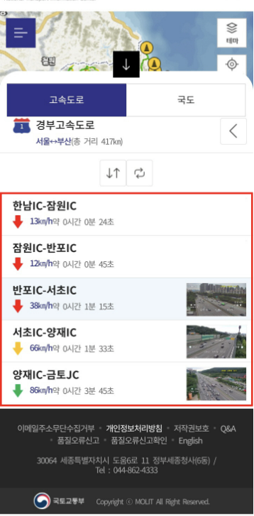 이 두 가지 방법의 차이는 국가교통정보센터는 국토부에서 운영하는 것으로 정보의 신뢰도가 높고, 고속도로 교통정보의 경우에는 좀 더 다양한 서비스가 제공된다는 점입니다.