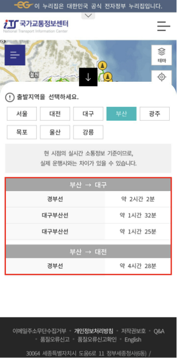 - 도시간 소요시간 메뉴에서는 실시간 고속도로 교통상황을 바탕으로 목적지까지 예상 소요시간을 표시합니다.