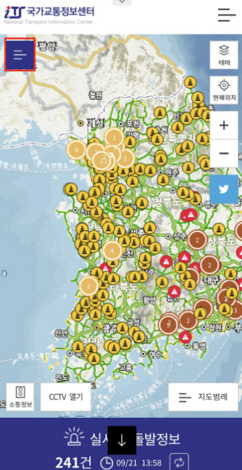 메뉴 > CCTV클릭 > 원하는 고속도로, 국도를 선택합니다.