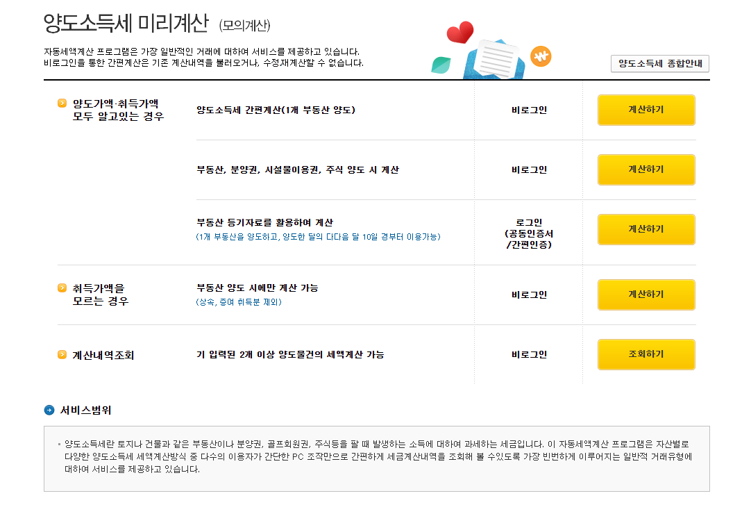 1개 부동산 양도소득세 자동계산외에는 모두 로그인을 하셔야 하고, 로그인의 경우에는 간편 인증이나 공동, 공인인증서가 필요하다는 점을 참고하시기 바랍니다.