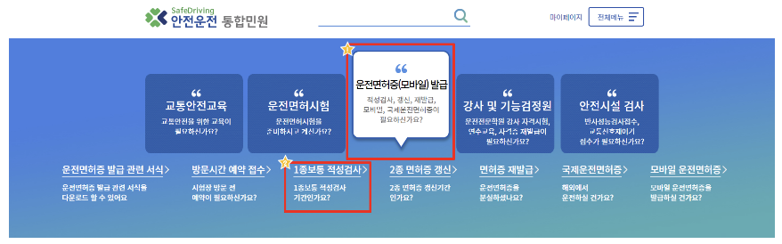 1종 운전면허의 경우 2011년 12월 9일 이후 면허 취득자 적성검사자는 10년 주기(1년 기간)로, 이전 면허 취득자 적성검사자는 7년 주기(6개월 기간, 면허증 상 표기된 기간)로 하여야 합니다.