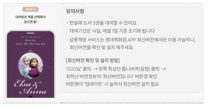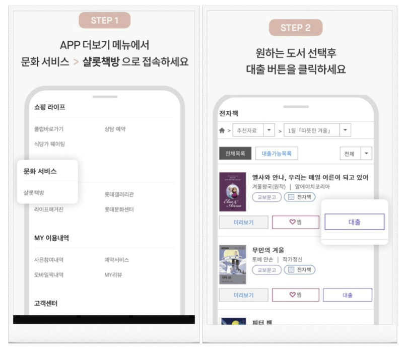 롯데백화점 앱 > 더보기메뉴 > 문화서비스 > 샬롯책방 > 도서 선택 후 대출