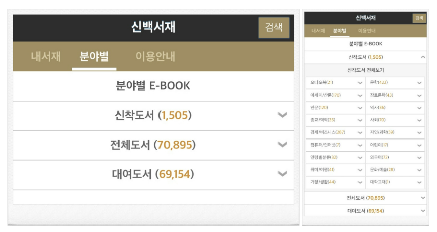 - 우측 상단 메뉴 '전자도서관' 클릭 후 전자책 홈페이지로 이동