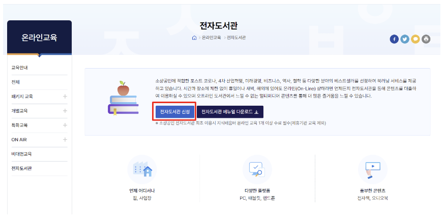 - 소상공인지식배움터 ID / 수정한 전자도서관 PW로 로그인 후 이용가능