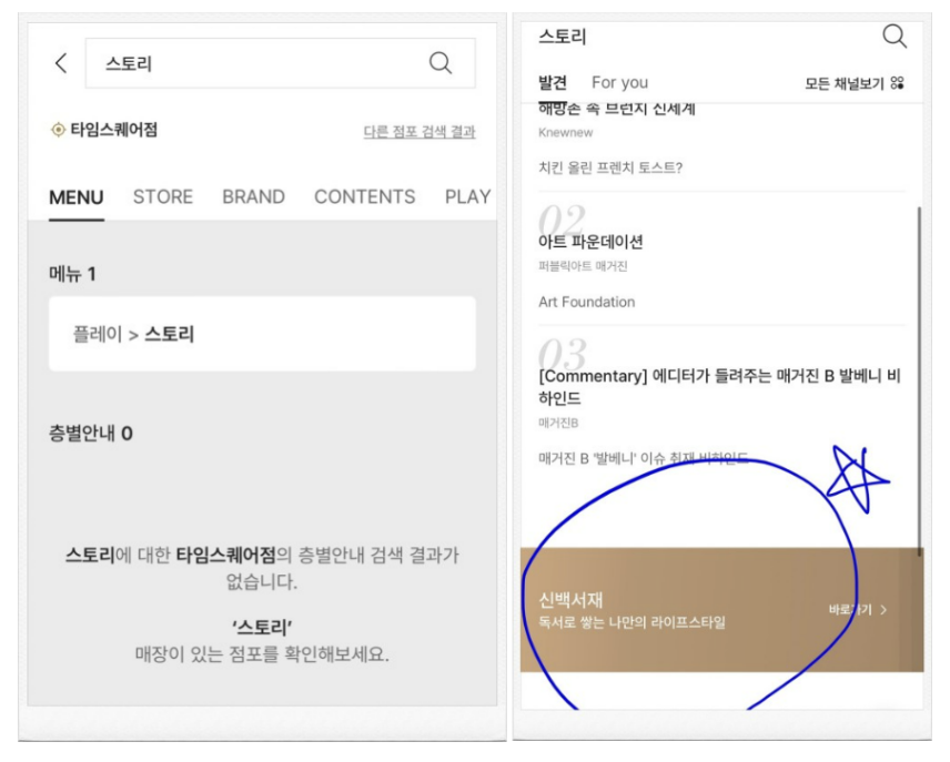 신세계백화점 어플을 다운받고나서 왼쪽에 스토리를 누르시면 돋보기 모양이 검색창이 나옵니다.