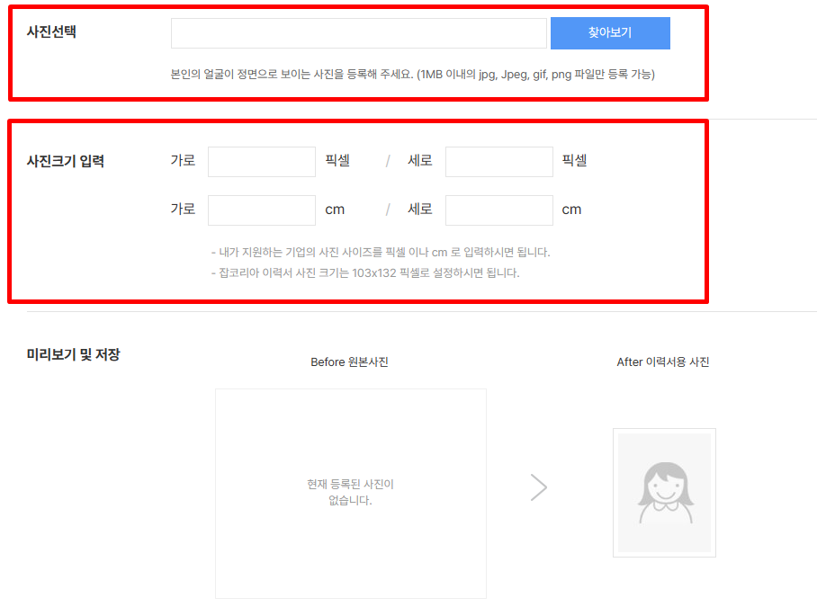 잡코리아 사진 크기조정은 별도의 로그인 없이 무료로 사용이 가능합니다.
