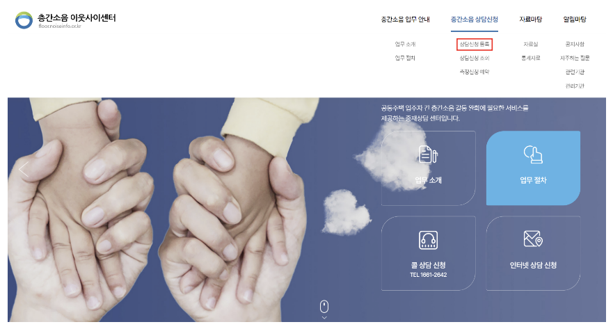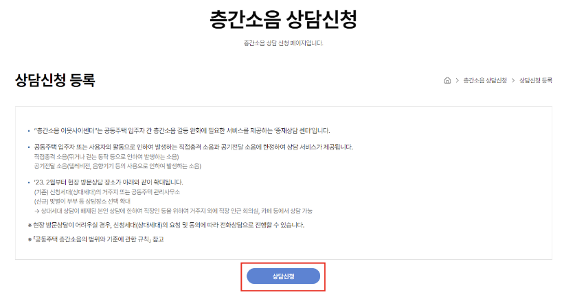 홈페이지에 접속하여 층간소음 상담신청에서 '상담신청등록'을 눌러주세요.