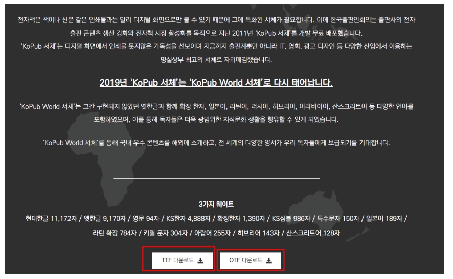 한국출판인회의 홈페이지에서 KoPub 폰트 World와 2.0 중에 다운로드 하시면 됩니다.