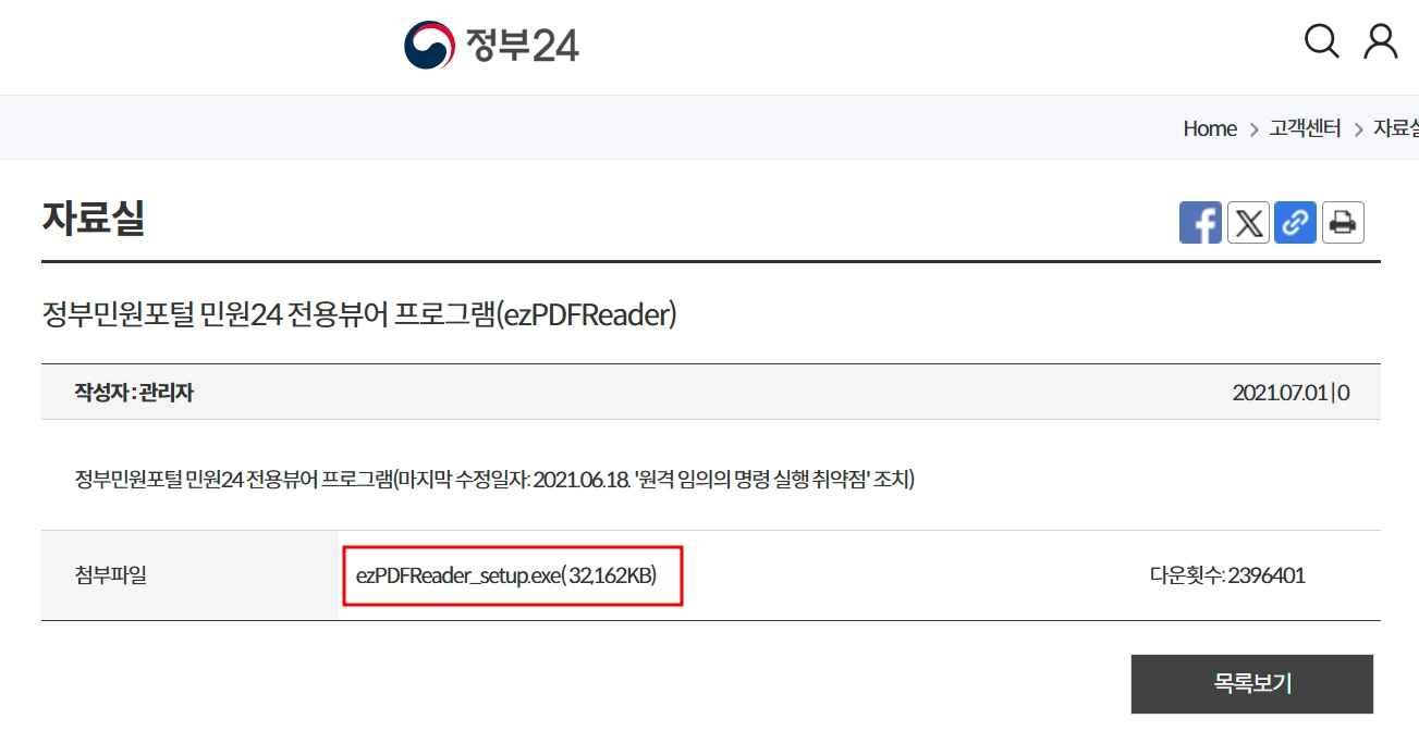정부24와 같은 국가기관에 접속을 하게되면, 보안문제로 보안 프로그램, 각종 설치프로그램 등 여러가지 설치를 해야 하는일이 꽤 많습니다. 이러한 귀찬기도 하고 오류가 생기면 골치가 아픈데요. 설치프로그램 중 가장 많이 설치하는 것은 ezPDF Reader 라는 파일인데요.